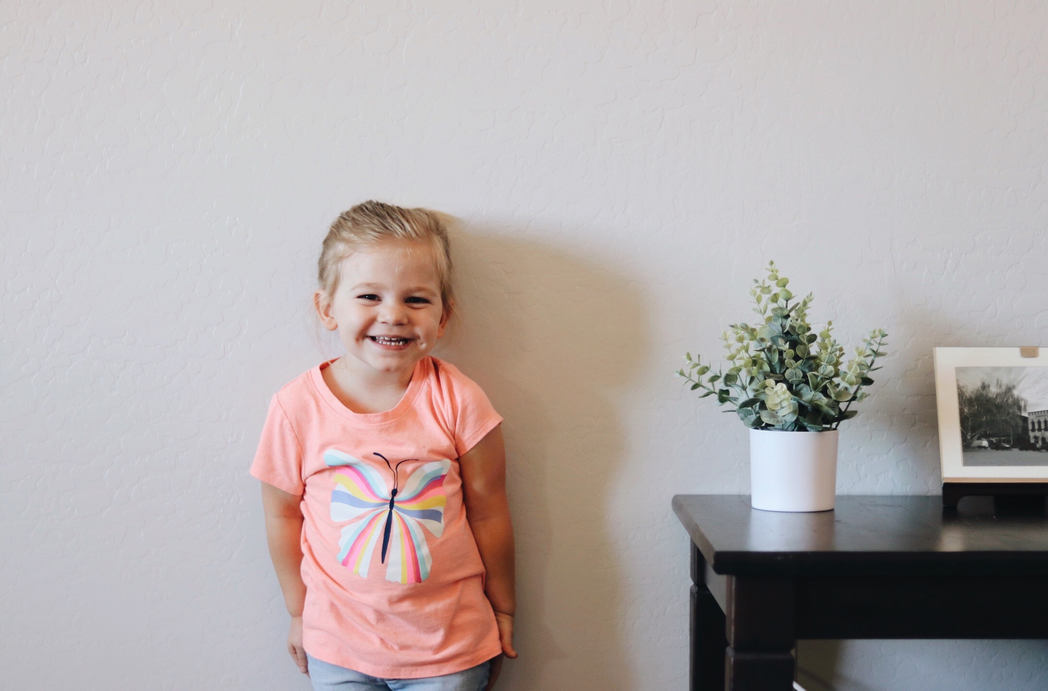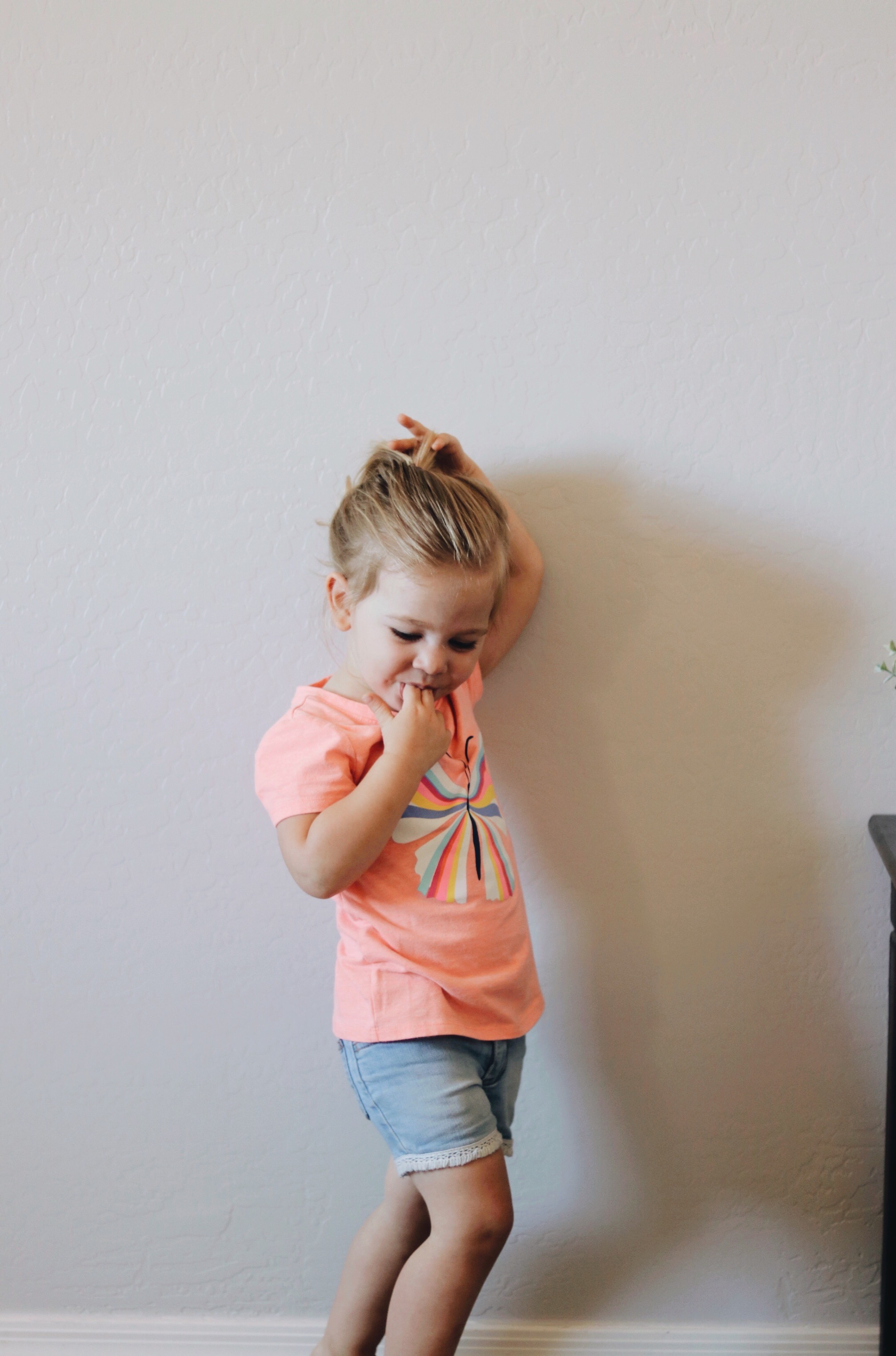 On Friday, we introduced underwear and shorts (I chose looser shorts that were easier to pull up and down). Pulling them up-and-down was a little tricky for her at first (and things still end up a little cheeky at times), but I knew that it was important for her to be able to do it herself. I was honestly amazed at how well she did with the addition of underwear and shorts. We had zero accidents on day three. She made it to the bathroom in every instance with enough time to take clothes off, climb the stool, and sit down.